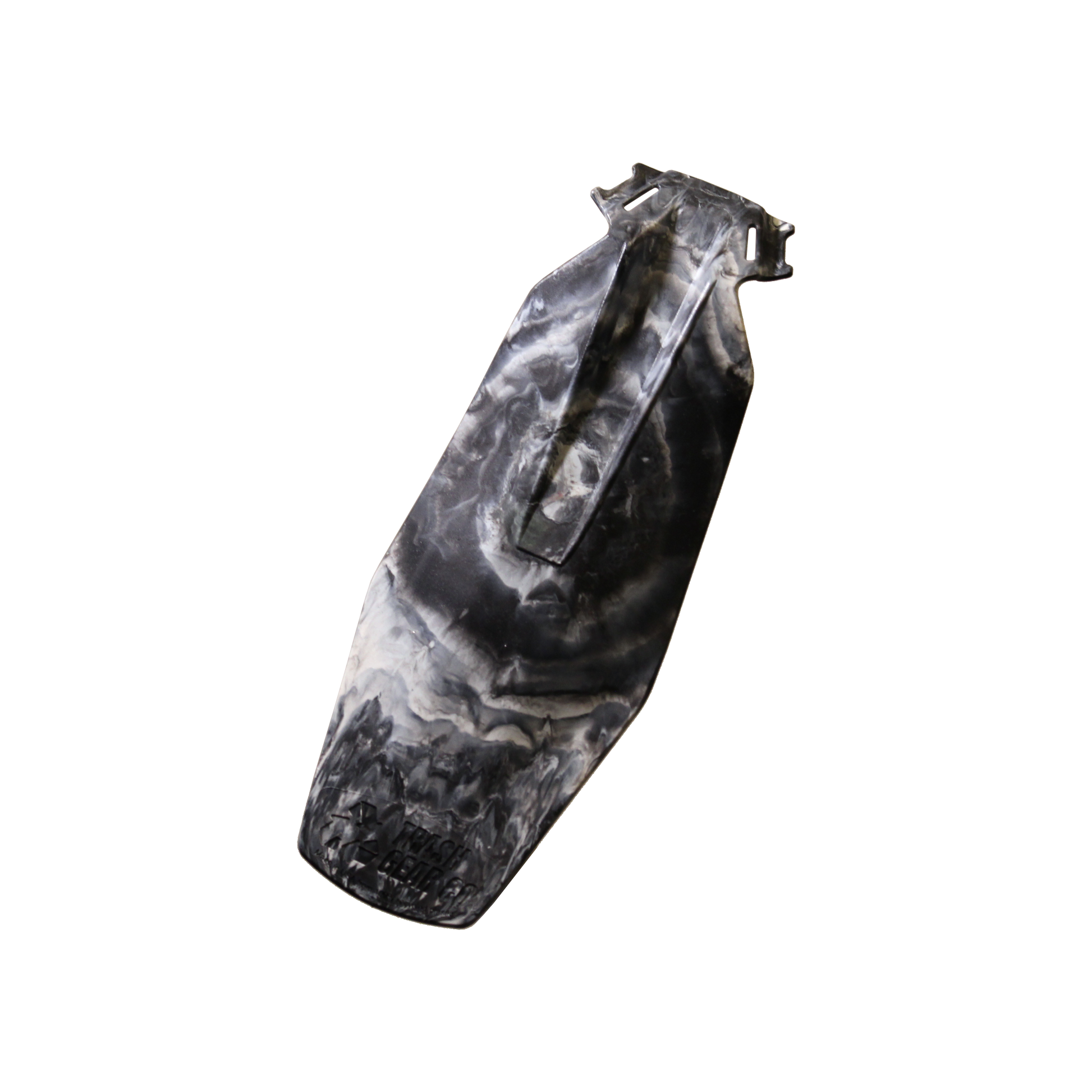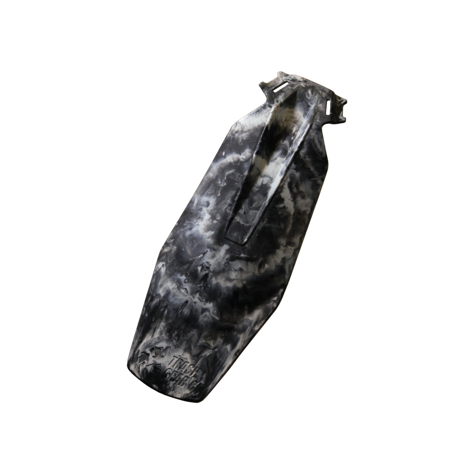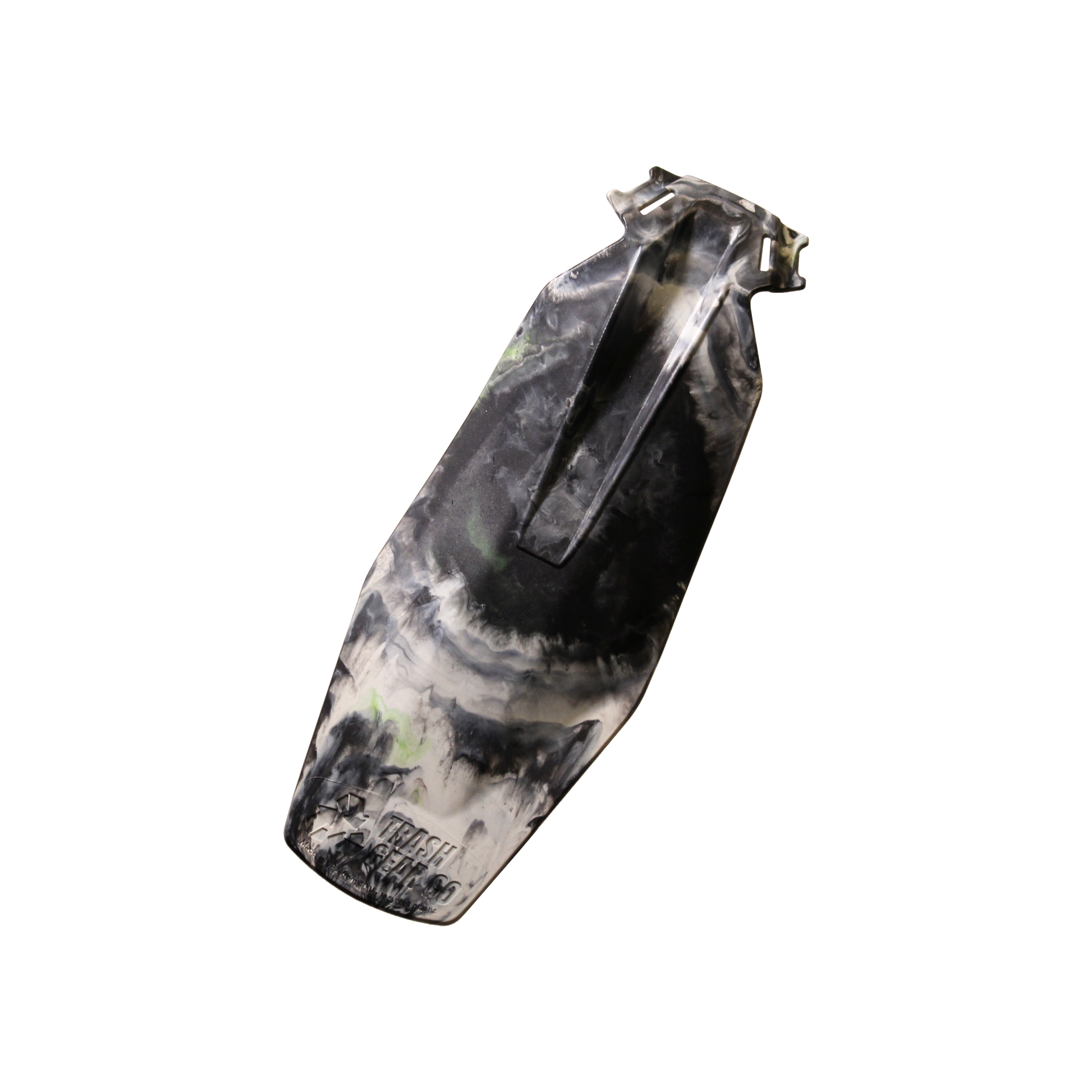 Keep your fanny dry and the landfills clean with this 100% post consumer waste eco plastic seat mounted fender. Just use the included velcro strap to strap the fender to your saddle rails and you're ready to rip. We shred up plastic collected from the community for all of our products, this means the color of every Trash Gear Co product is completely unique, Like a beautiful little snowflake. Ride in style with green gear and a clean conscience.